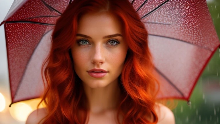 Gorgeous red hairs woman, busty, entirely nude, under the rain, blue eyes,