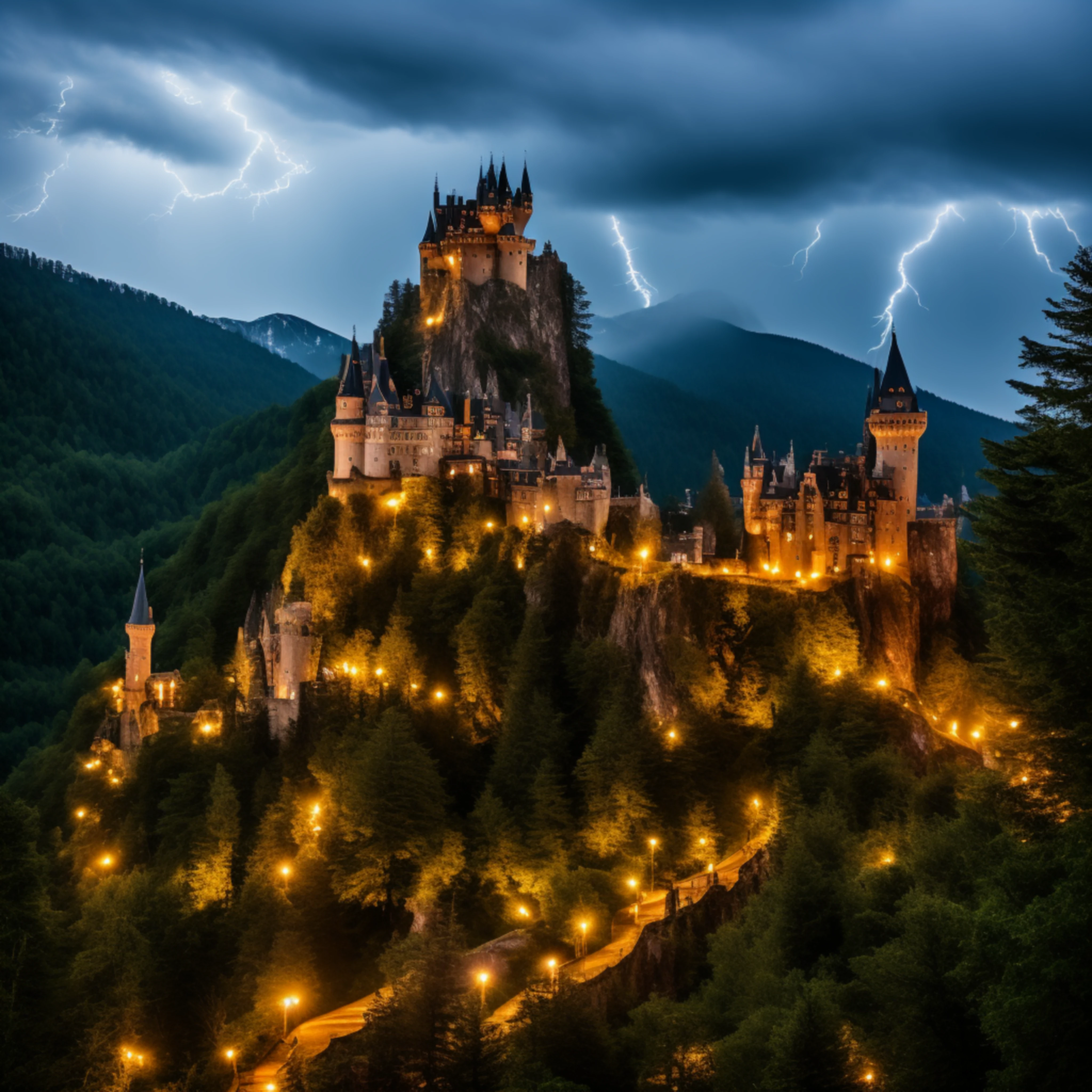 SPOOKY FAIRY TALE CASTLE ON THE TOP OF A MOUNTAIN IN A NIGHT STORM, WITH LIGHTNING.