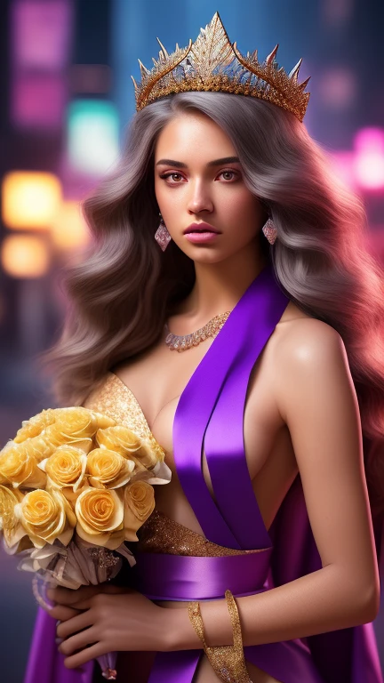 Miss NEW YEAR 2024 pageant, attractive young woman in her 20's, Eveningwear Style, wearing a ((single purple sash)), and ((diamond encrusted tiara gold crown)), holding bouquet of yellow roses, midshot portrait, natural light, dark skin, natural look, hazel eyes, light brown hair, upper torso portrait, blurred background, natural light, photograph, detailed -- taken using a Canon EOS R camera with a 60mm f/4 lens, f/2.2 aperture, shutter speed 1/200s, ISO 300, Hyper Realistic Photography, Hyperdetail, Ultrahd, Color Correction, hdr, color grading, 8k --ar 4:5 --q 2