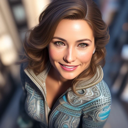 35 year old woman looking up smiling at camera lens ((photo taken from directly over her camera lens pointing down)), ((3d)), ((ultra-realistic)), ((action poses)), ((detailed background)), ((detailed bodies)), ((detailed faces)), ((detailed hands)), ((surrealistic)), ((highest resolution)), ((highest quality)), ((clothed)),