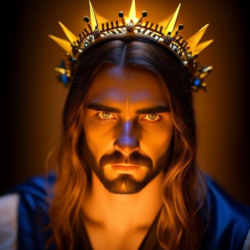 Jesus Christ face crown of thorns yellow and blue light realistic