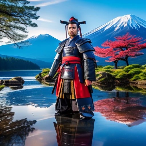 Create an image of a traditional Japanese samurai in full armor. The samurai should be standing with a composed and dignified posture. The background should prominently feature Mount Fuji, symbolizing the beauty and culture of Japan. The scene should capture the essence of ancient Japan, with attention to detail in the samurai's attire, including the kabuto (helmet), the intricate patterns of the armor, and a katana (samurai sword) either held or sheathed. The overall atmosphere should be serene yet powerful, reflecting the samurai's discipline and the majestic presence of Mount Fuji.