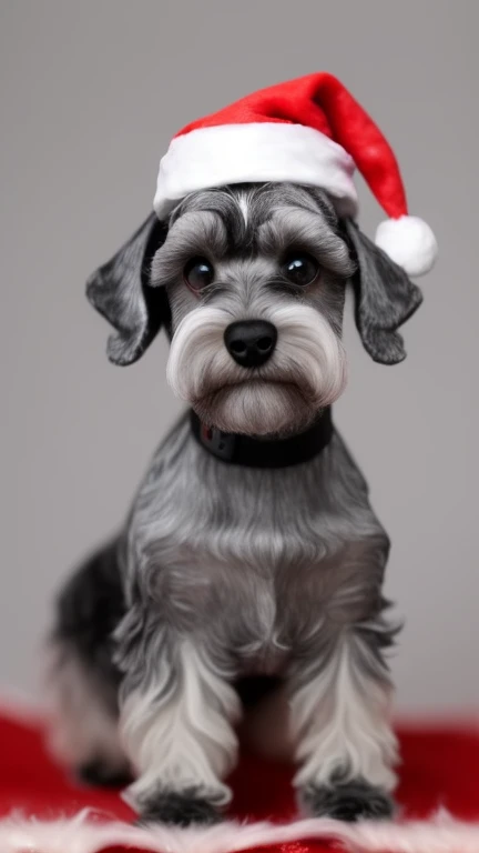 Miniature Schnauzer mostly black with a little gray wearing santa hat