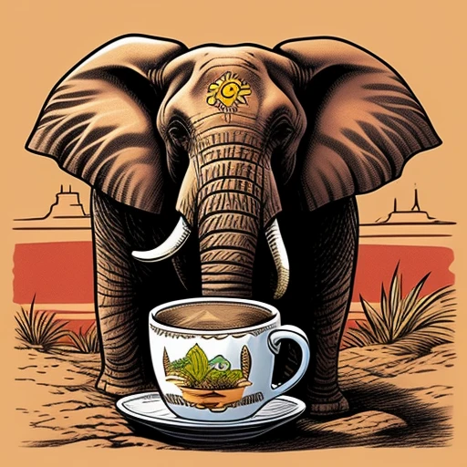 a elephant, his trunk is into a cup of c...