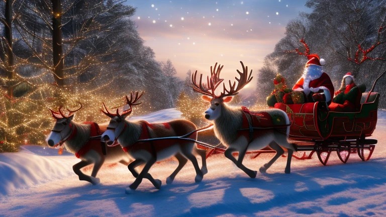 Rudolph the Red-Nosed Reindeer, depicted in full profile facing left featuring large, branched antlers and using his ((luminous red nose)) to lead the reindeer team and guide ((Santa's sleigh)) on Christmas Eve. in 3d, ((realistic)), ((action poses)), ((detailed background)), ((detailed bodies)), ((detailed faces)), ((detailed hands)), ((highest resolution)), ((highest quality)), ((clothed))