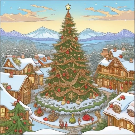 Christmas tree in Christmas card Mucha style aerial view
