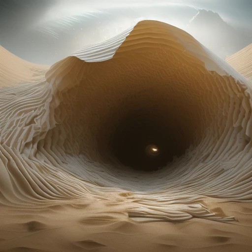 An epic illustration of a gigantic long line of connected empty paper rolls bursting up out of the ground like a sandworm, in a huge spray of sand and loose shreds of toilet paper. masterpiece, best quality, highres, high resolution, sharp focus, high detail, cinematic shadow, hdr, cardboard tube.