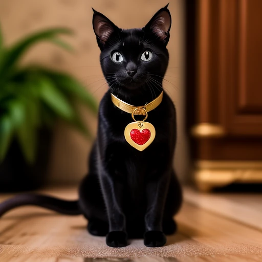 create an image of a black cat sitting forward, smiling, wearing a red collar with a gold heart-shaped tag engraved with the word "Meow." It's set against a backdrop of a home kitchen interior with the floor littered with dead small mice, some of them carrying a small piece of cheese.