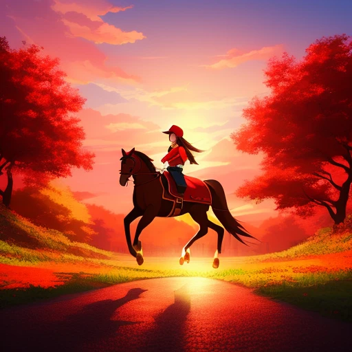 I was wearing a red cap and riding a horse - illustrate this scene in an anime style