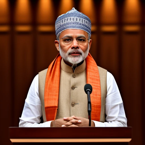 Ultra realistic, Narendra Modi wearing Muslim skull cap behind podium addressing Congress workers.