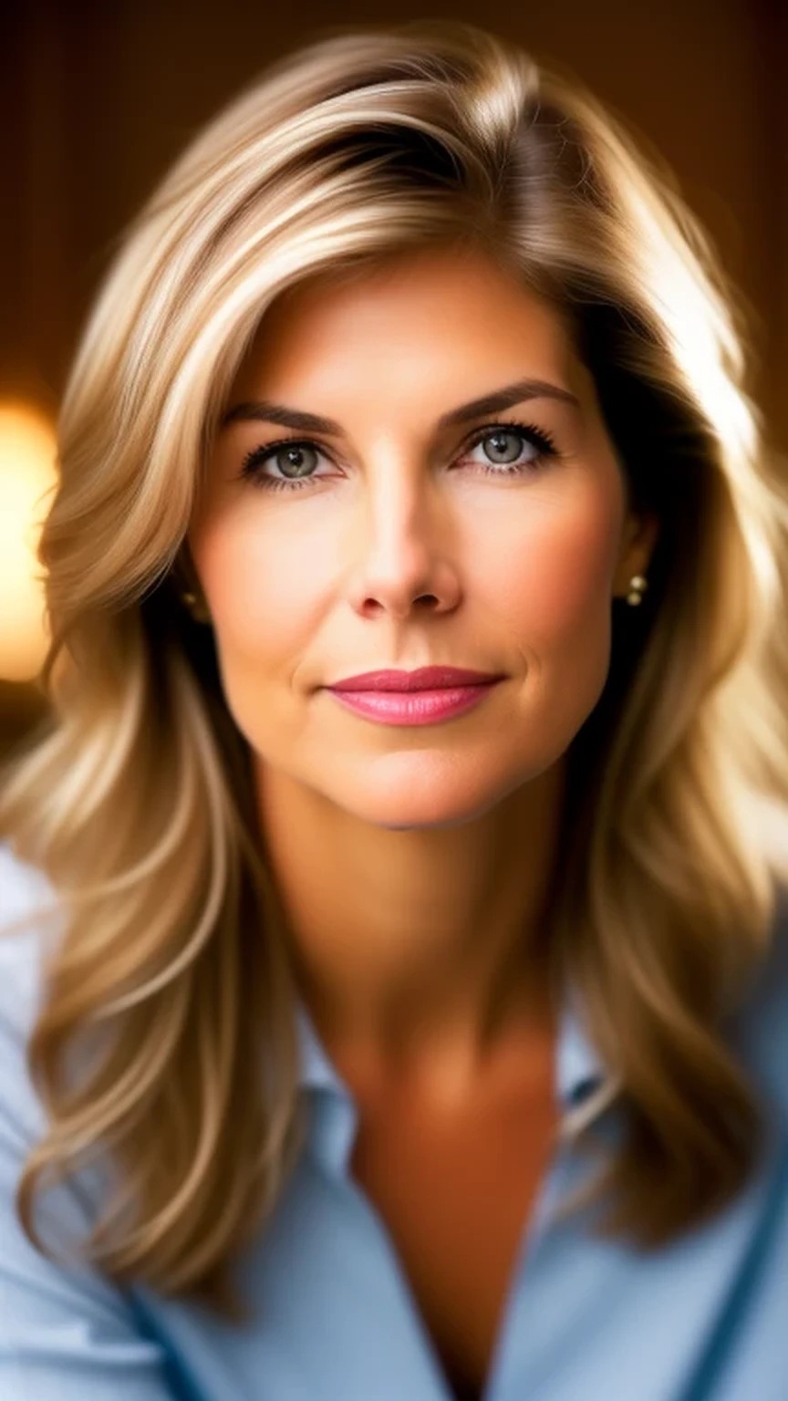 A photorealistic portrait of CNN anchor Sharyl Attkisson, circa 1995. Her light brown hair has blonde highlights and her features are in sharp focus with very fine detail.