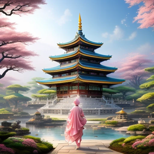 a spotted dog, lightblue dots 150%, head disguised like a duck, more pink dots please, and a Japan style temple in the back