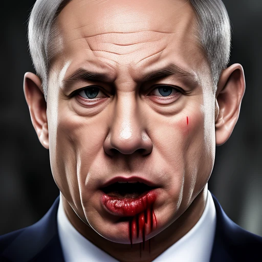 Benjamin Netanyahu inside putin, vertically split, split ((vertically)), Benjamin Netanyahu inside putin, close up portrait, blood, red eyes, aggresive, screams, toxic, hitlers head inside putins head, blood in mouth