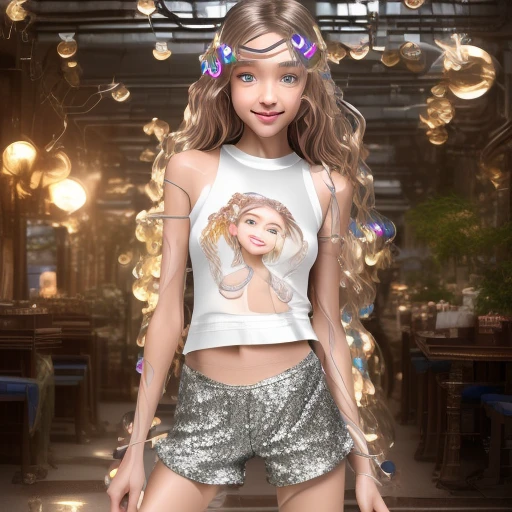 , ,ulzzang-6500, (original: 1.2), (realistic: 1.3) (mixed Korean), beautiful girl with beautiful details, extremely detailed eyes and face, eyes with beautiful details, absurd, incredibly absurd, huge file size, ultra detail, high resolution, ultra detailed, best quality, masterpiece, illustration, ultra detailed and beautiful, ultra detailed, CG, unity, 8k wallpaper, amazing, fine Detail, masterpiece, top quality, official art, extremely detailed CG unity 8k wallpaper, cinematic lighting, (perfect shiny skin:0.6), (light skin:1.2),brown hair, slim and smooth lines, (shiny streamers sequins tops:1.5), (white color skinny High-waisted shorts:1.5), cafe, blushing, ashamed, brown hair, wet, standing, happy, (smile:1.3), front view, sweating, holding , holding front, untied, light blue eyes, put hands between legs
