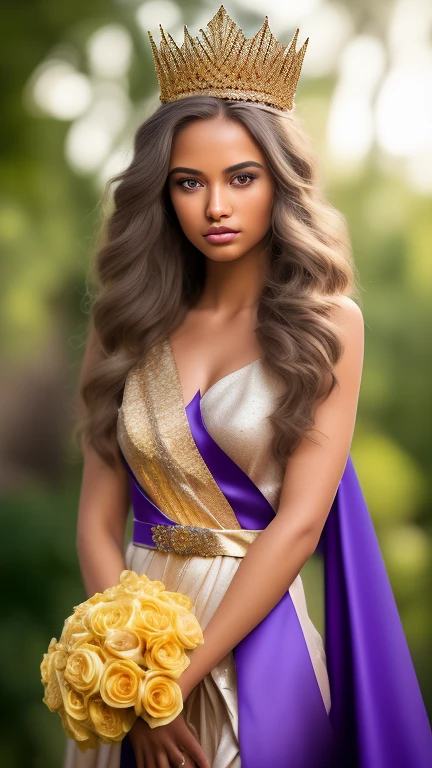 Miss NEW YEAR 2024 pageant, attractive young woman in her 20's, Eveningwear Style, wearing a ((single purple sash)), and ((diamond encrusted tiara gold crown)), holding bouquet of yellow roses, midshot portrait, natural light, dark skin, natural look, hazel eyes, light brown hair, upper torso portrait, blurred background, natural light, photograph, detailed -- taken using a Canon EOS R camera with a 60mm f/4 lens, f/2.2 aperture, shutter speed 1/200s, ISO 300, Hyper Realistic Photography, Hyperdetail, Ultrahd, Color Correction, hdr, color grading, 8k --ar 4:5 --q 2