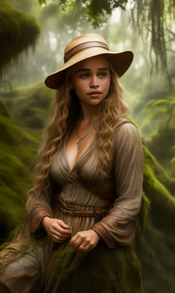 photorealistic, natural, portrait of Emilia Clarke wearing Indiana Jones clothes and hat in rainy jungle