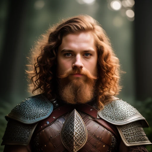 portrait of dwarf wearing chain mail over leather armor, viking-style helmet, green eyes, dark-ginger short curly hair, dark-ginger bushy mustache and dark-ginger medium beard, (small head): 1, malicious smile