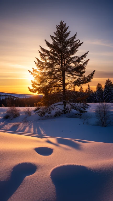 snowy winter sunset, sharp focus, visibl...