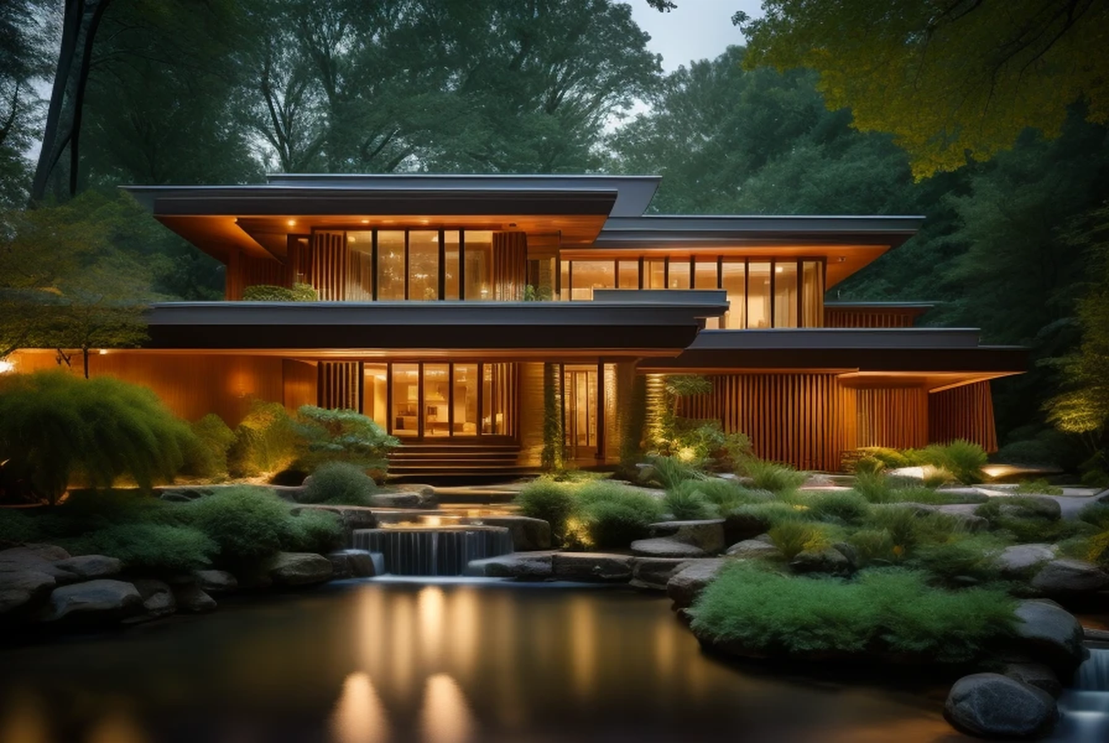 ((8K UHD highly-detailed wide-angle Nikkor 24mm f/16 architectural image of a house)) which is a mix of ((Frank Lloyd Wright's "Falling Water" 1.9)) and ((Stahl House 1.9))