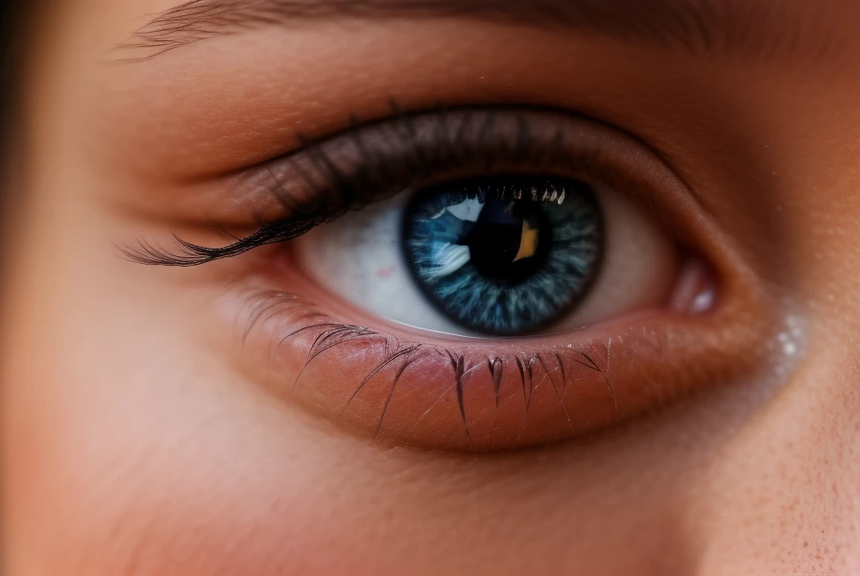 ((Associated Press extremely-high resolution, extremely detailed close-up)) of an anatomically correct human female eye, with the eye wearing mascara, black eye liner, and dark blue eye shadow. The image includes the eyebrow and surrounding skin, but not the nose or other parts of the face. The focus is on the eye itself, and the level of anatomical detail is on par with a medical reference book: all the details of the iris; the color variations within the iris; the small capillaries found in the white portions of the eye, etc.