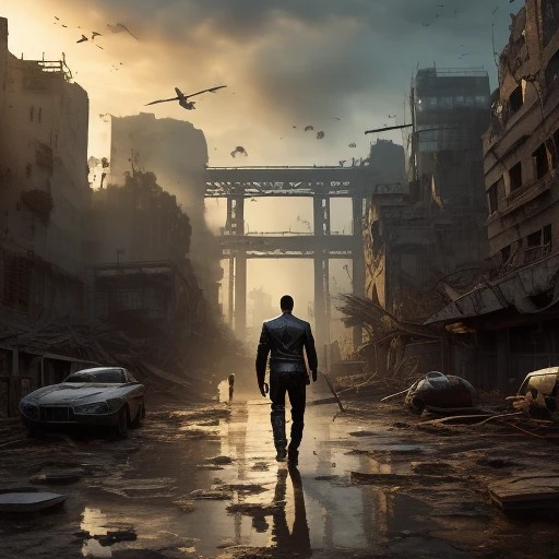i am legend, Will Smith, black leather jacket, city ruins in the background, destroyed bridge, capybara walks along, highly detailed, [ok i pull up], best quality, high res