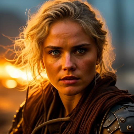 Furiosa - Hair: white cut hair Huge boobs, deep cleavage Eyes: Piercing blue eyes, conveying a sense of resilience and determination. The eyes have a sharp, focused look, reflecting the character's survival instincts. Facial Shape: The face is oval, with prominent cheekbones and a strong jawline, which adds to her rugged and determined appearance. Skin: The skin is sun-tanned and weather-beaten, with a few scars that tell stories of survival and battles fought. There's a toughness to her complexion, yet it retains a certain youthful resilience. Prosthetic Arm: A distinct feature is her mechanical prosthetic arm, which is a combination of metal and makeshift parts. It's functional yet has a rough, improvised look, symbolizing her resourcefulness and adaptability in a world where resources are scarce. Expression: Her facial expression is one of steely resolve mixed with a hint of weariness. It's clear that she has endured many challenges but remains unbroken and steadfast. Overall Appearance: Her overall appearance is one of a battle-hardened survivor, who has adapted to the harsh realities of a post-apocalyptic world. Her clothing is a mix of leather and metal, designed more for function than fashion, with protective elements to withstand the rigors of the wasteland.