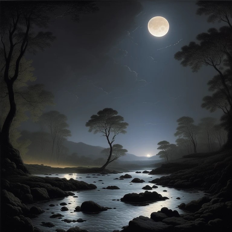 stream among ancient black rocks under nocturn, dark sky, perfect circular full moon, Jacques-Laurent Agasse style