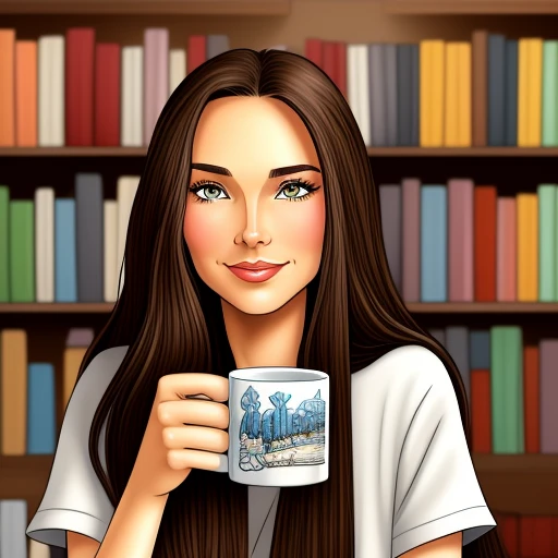 close up cartoon of a beautiful western brunette, brown eyes, 36 years old, long straight hair, wearing a black band t-shirt and sipping coffee, bookstore background