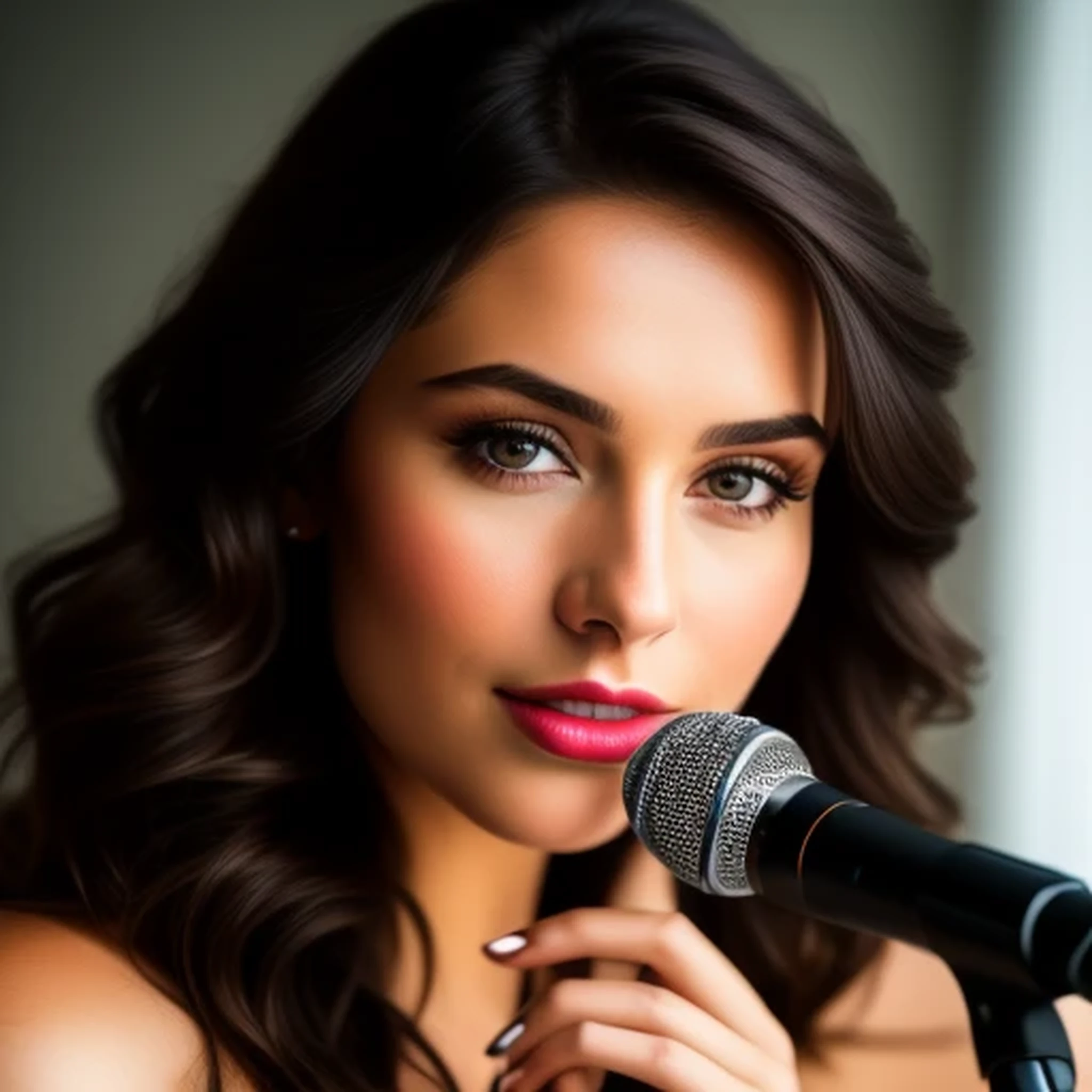 Beautiful seductive brunette woman singing, holding a microphone, close up, photographic