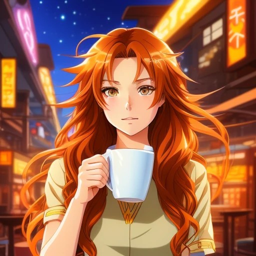girl with middle hair brown,brown eyes,orange chlotes and she is drink coffe