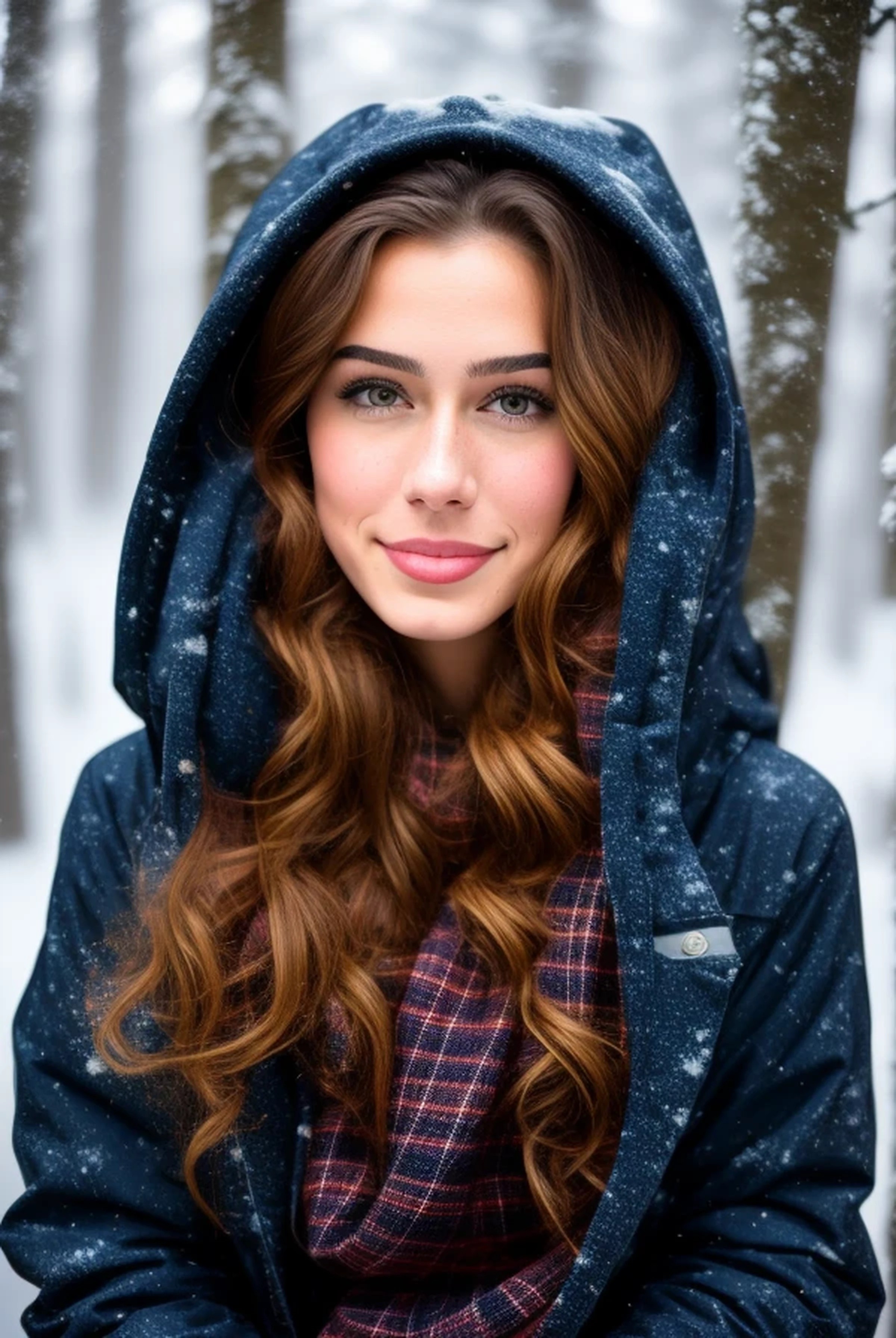 (8K UHD, 50mm f2.8 Nikkor outdoor portrait with bright, diffuse light on a very snowy winter morning) of a young (fair-skinned Caucasian) woman in a heavily wooded park. ((She has shoulder-length, shiny and healthy dark red hair, parted in the center, styled with hair gel, then given a salon blow-out to achieve maximum "big hair" volume))). She has (soft, pale blue-gray eyes 1.8)) with (perfect round irises), (round, dark pupils), (long, thick lashes), ((a thick line of eyeliner 1.9)), and (glittering silver eye shadow 1.8). ((Her eye makeup is heavy, colorful and intense 1.9)) (Liberal use of concealer and dark pink blush on the crest of her cheeks gives her skin a smooth, flawless look). The woman is in her early twenties, and ((wearing a plaid Pendleton wool scarf under a navy blue North Face ski parka with hood 1.9))). (She is tall, slender and athletic). Facially, she's an exact match for (((Lawfare's Anna Bower 1.9))). She has (full, sensual lips, though the upper lip is less full than lower lip). She also has ((puffiness under her eyes and deep lines demarcating the bottom of those bags)), and ((lightly freckled skin, which is just barely visible through her makeup 1.9)). ((She has a significant overbite, with the front two teeth of the top row sit slightly forward of the rest and creating a very slight buck-toothed grin 1.3)). (She has long, fine eyelashes), pressed so the upper ones curl upwards. (Her lips show fine vertical lines and some chapping under dark polished bronze lipstick.