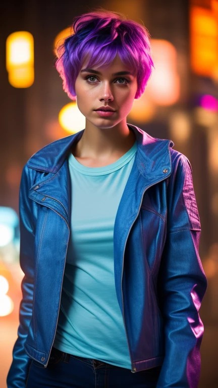 woman blue pixie cut hair nude tight denim jacket at home