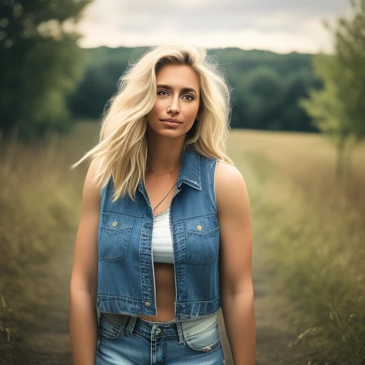 Beautiful countryside ((French))female blonde, ((photo realistic)), d-cup, no shirt, perky boobs, (topless), tight denim shorts, thick thighs