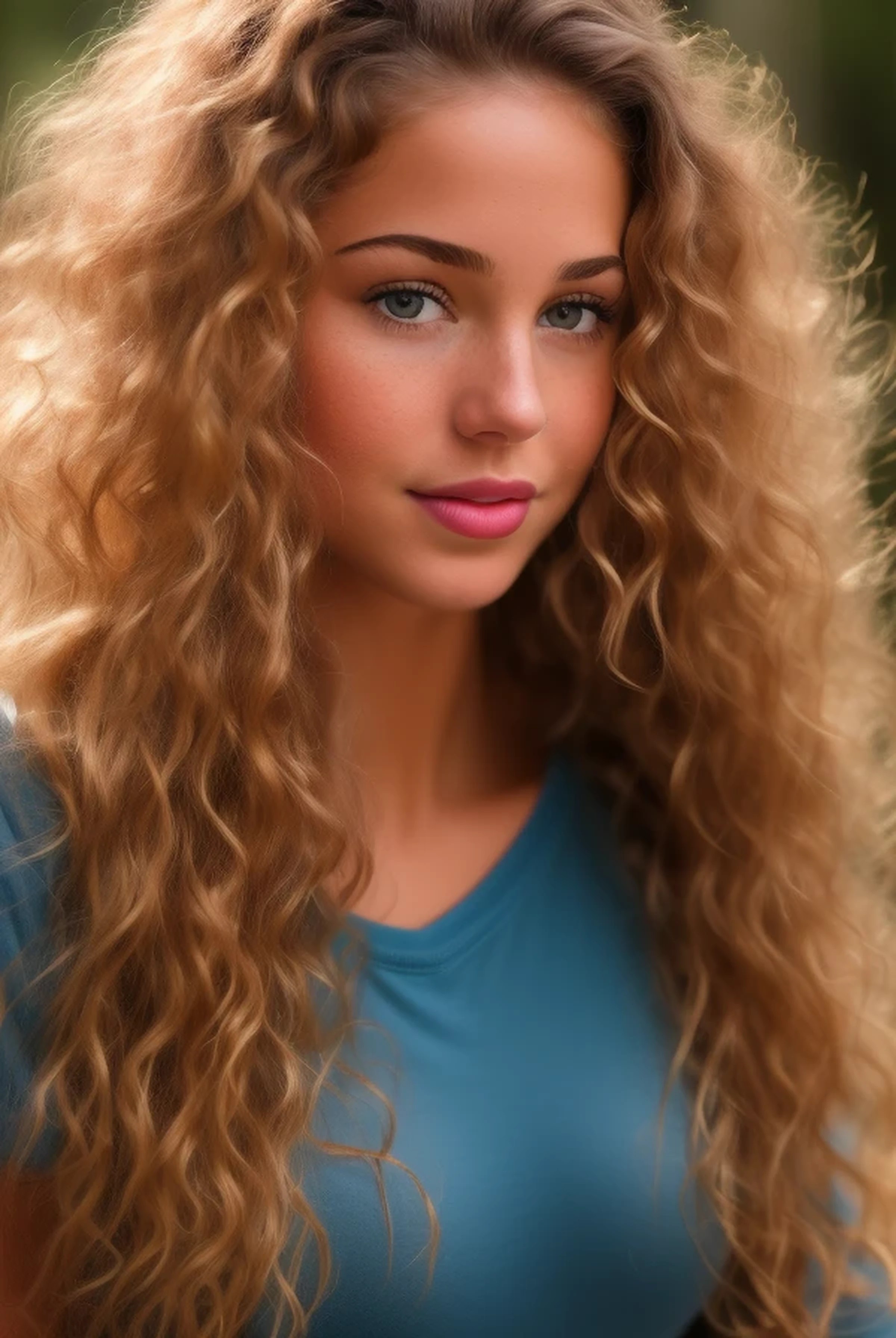 ((Ultra high-resolution, high depth of field, very sharp focus, Associated Press portrait)) of a young ((fair-skinned Caucasian)) woman in a park, smiling. (((The picture shows her face, hair and clothing in exceptional detail: every hair, texture, fine line and subtle make-up detail in sharp focus, like a frame of IMAX film))). She has (((very short dark brown hair that is crew cut on the back and on the sides 1.8))), but ((permed and bleached above the ears so it's a mass of tight blonde curls on top 1.9)). The roots of the hair are a very dark brown, and ((the hair has lots of teased-out volume, flowing back from the hairline 1.7)). She also has (((pale blue-gray eyes))) with (large, dark pupils), (long, dark lashes), (dark eyeliner lending a thick outline to both lids 1.9), and dramatic (dusky maroon eye shadow 1.8). (Some concealer make-up, and dark bronze blush on the crest of her cheeks, masks her blemishes and facial imperfections). The woman is in her late teens or early 20s and dressed in (a dark blue t-shirt). (She is tall and slender), with (shapely C-cup breasts). Facially, she's a mix of (porn star Athena Palomino 1.9) and (model Noelle Brown 1.8), with (the eyes and nose of Olivia Newton-John 1.9). She has (full, sensual lips, though the upper lip is less full than lower lip). She also has (((visible puffiness under her eyes, a bluish cast to those bags, and deep lines separating that puffiness from her cheeks))), and ((a light sprinkling of light, indistinct freckles across her cheeks, nose and chin with the concentration heaviest on her nose)). (She has a significant overbite, with the front two teeth of the top row sit slightly forward of the rest and creating a mildly buck-toothed grin 1.8). (She has long, fine eyelashes), pressed so the upper ones curl upwards. ((Her lips show fine vertical lines, and are done up in glossy dark burgundy lipstick)).