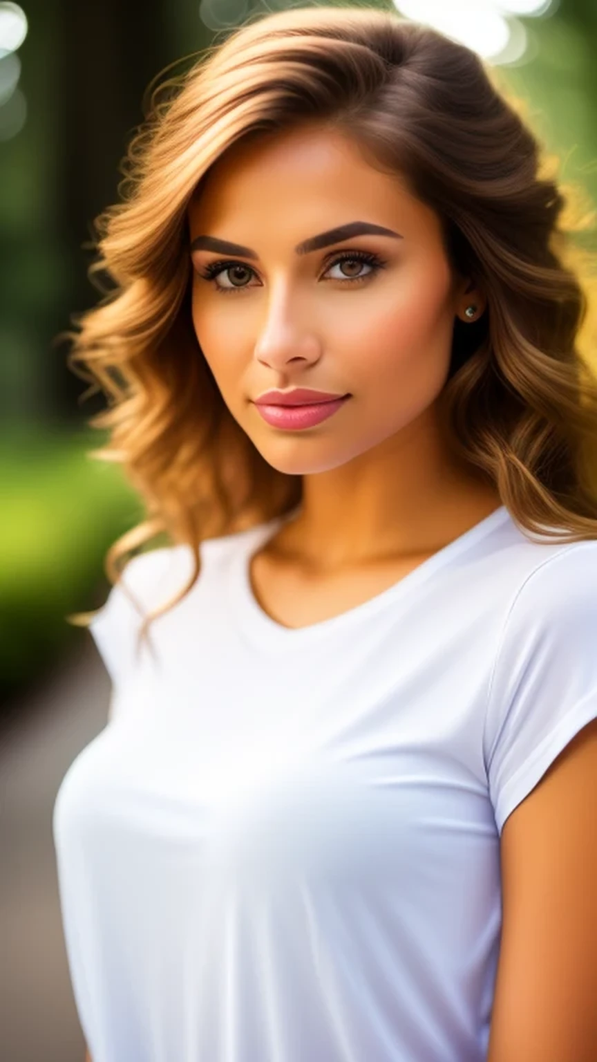attractive 25 year old woman, light skin, natural look, hazel eyes, light brown hair, upper torso portrait, blurred background, see-thru t-shirt, natural light, photograph, detailed --ar 4:5