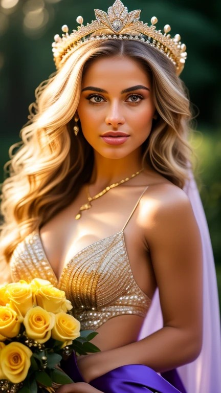 Miss NEW YEAR 2024 pageant, attractive young woman in her 20's, Eveningwear Style, wearing a ((single purple sash)), and ((diamond encrusted tiara gold crown)), holding bouquet of yellow roses, midshot portrait, natural light, dark skin, natural look, hazel eyes, light brown hair, upper torso portrait, blurred background, natural light, photograph, detailed -- taken using a Canon EOS R camera with a 60mm f/4 lens, f/2.2 aperture, shutter speed 1/200s, ISO 300, Hyper Realistic Photography, Hyperdetail, Ultrahd, Color Correction, hdr, color grading, 8k --ar 4:5 --q 2