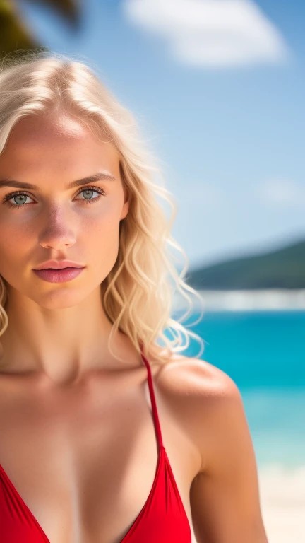 Palest lightest-skinned Europeans, highest resolution, highest quality, 64k, sharp focus, ultra detailed, red swimwear,