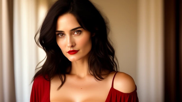 beautiful 25-years-old Carrie-Anne Moss, italian, dark Brown haired, Big black eyes, red Lipstick, long face, busty long red tshirt