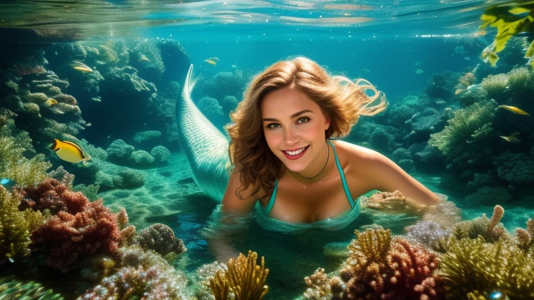 THE UNDERWATER WORLD Mermaid in 3d, ((choker-shot)), ((photo-realistic)), ((action poses)), ((detailed background)), ((ultra-detailed)), ((perfect face and body)), ((perfect smile and teeth)), ((highest resolution)), ((highest quality)), ((8k)), ((uhd))