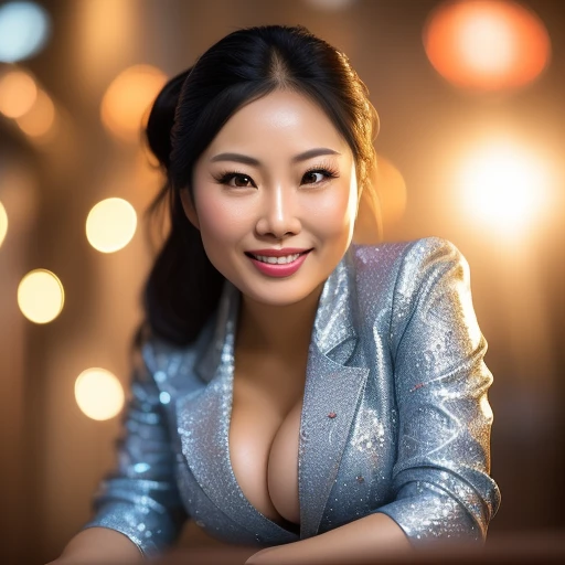 35 year old busty Asian woman looking up smiling at camera lens ((photo taken directly over her with camera lens pointing down)), ((3d)), ((ultra-realistic)), ((action poses)), ((detailed background)), ((detailed bodies)), ((detailed faces)), ((detailed hands)), ((surrealistic)), ((highest resolution)), ((highest quality)), ((clothed)), ((cleavage)), ((lens angle : down)),