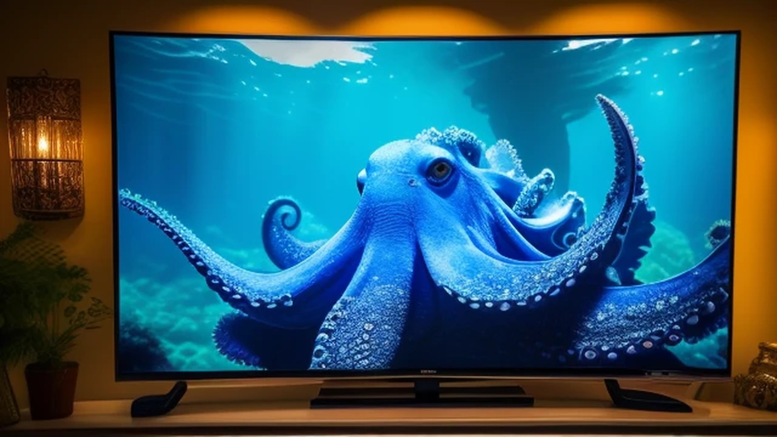 We see an old blue octopus watching TV. The television shows a Hitchcock film